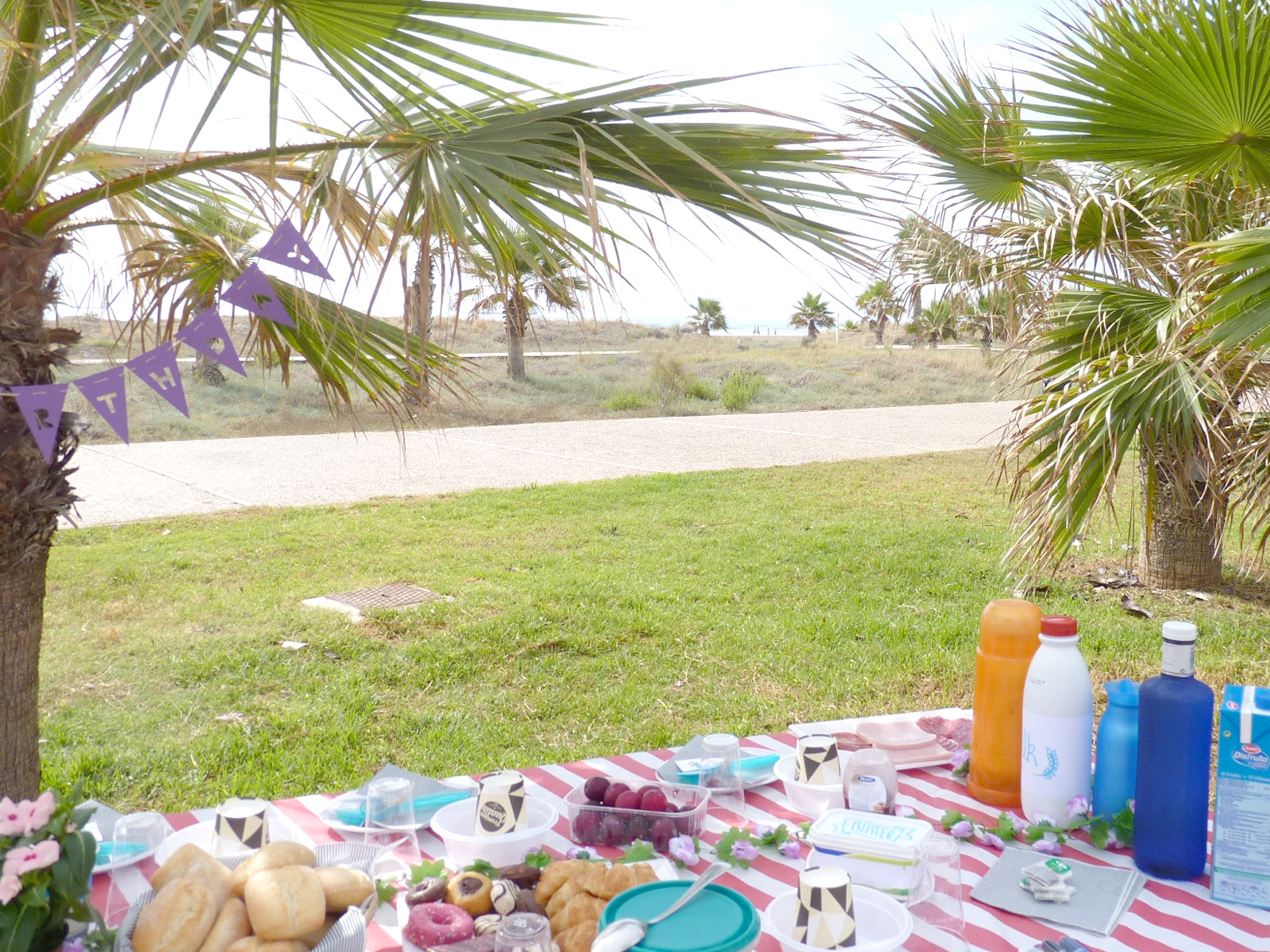 Debo decir que el paisaje y el clima ayudaron a que la fiesta-desayuno fuese perfecta, ya que es casi un privilegio poder montar un desayuno así al lado del mar, entre palmeras y césped. Aquí os dejo con algunas fotos que hice. Espero que os guste tanto como a nosotras. Y después os digo algunos detalles a tener en cuenta para preparar una mesa sencilla pero que sorprenda.