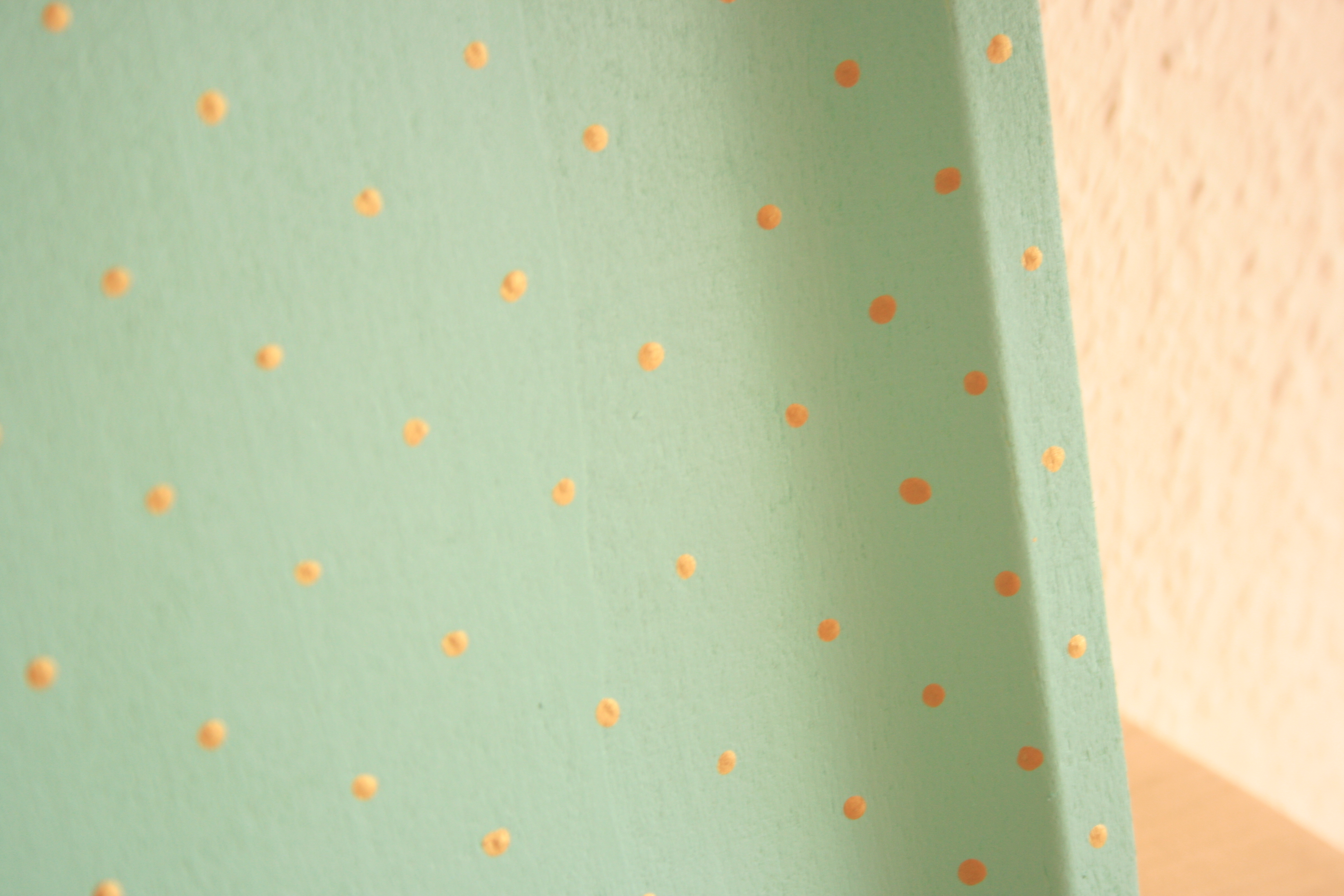 Una vez esté seca la segunda capa ya puedes pasar al color dorado. Creo que es una bonita combinación de color. Los puntos le dan un acabado diferente y elegante. Solo necesitas un pincel y con cuidado ir haciendo puntos. No es necesario que queden perfectos, puedes hacerlos aleatoriamente, sin ningún orden ni regularidad. No escatimes con la pintura (tampoco te excedas) y así obtendrás un ligero relieve. Déjalos secar, y listo.
