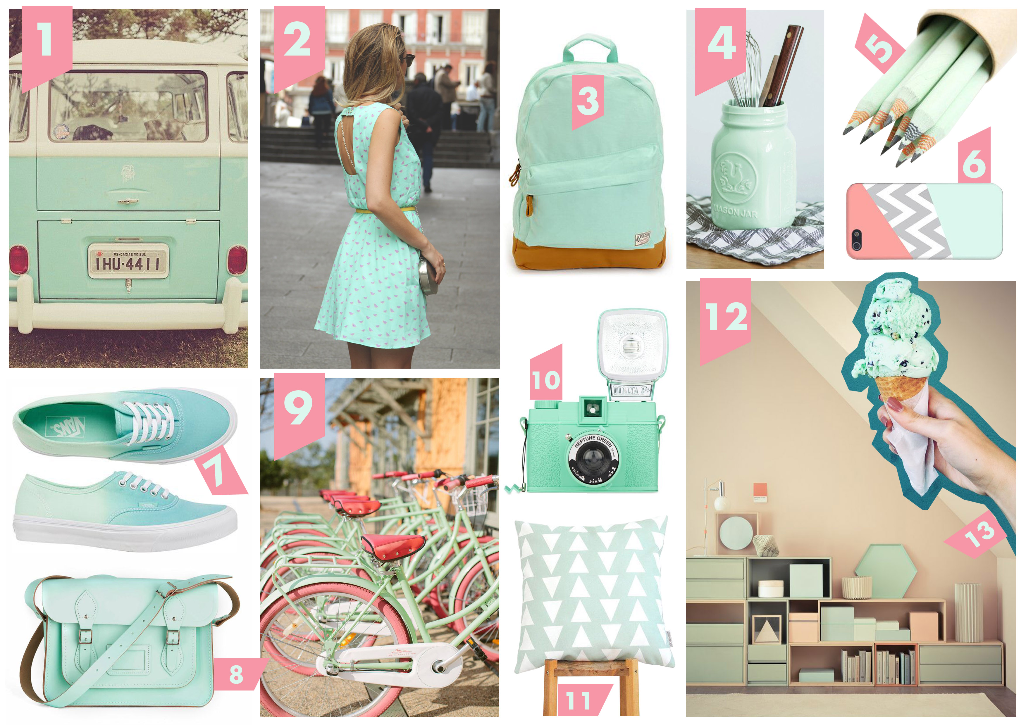 1. Retro Van / 2. Perfect Summer Dress / 3. Volcom Backpack mixed / 4. Lovely Kitchen / 5. Grey-Mint pencils / 6. IPhone Mint-Grey-Pink / 7. Ombré Mint Vans / 8. Vintage Bag / 9. Pink-Mint Bikes / 10. Lomography Bright Mint / 11. Geometric Pastel / 12. Pastel Home / 13. Mint Ice Cream
