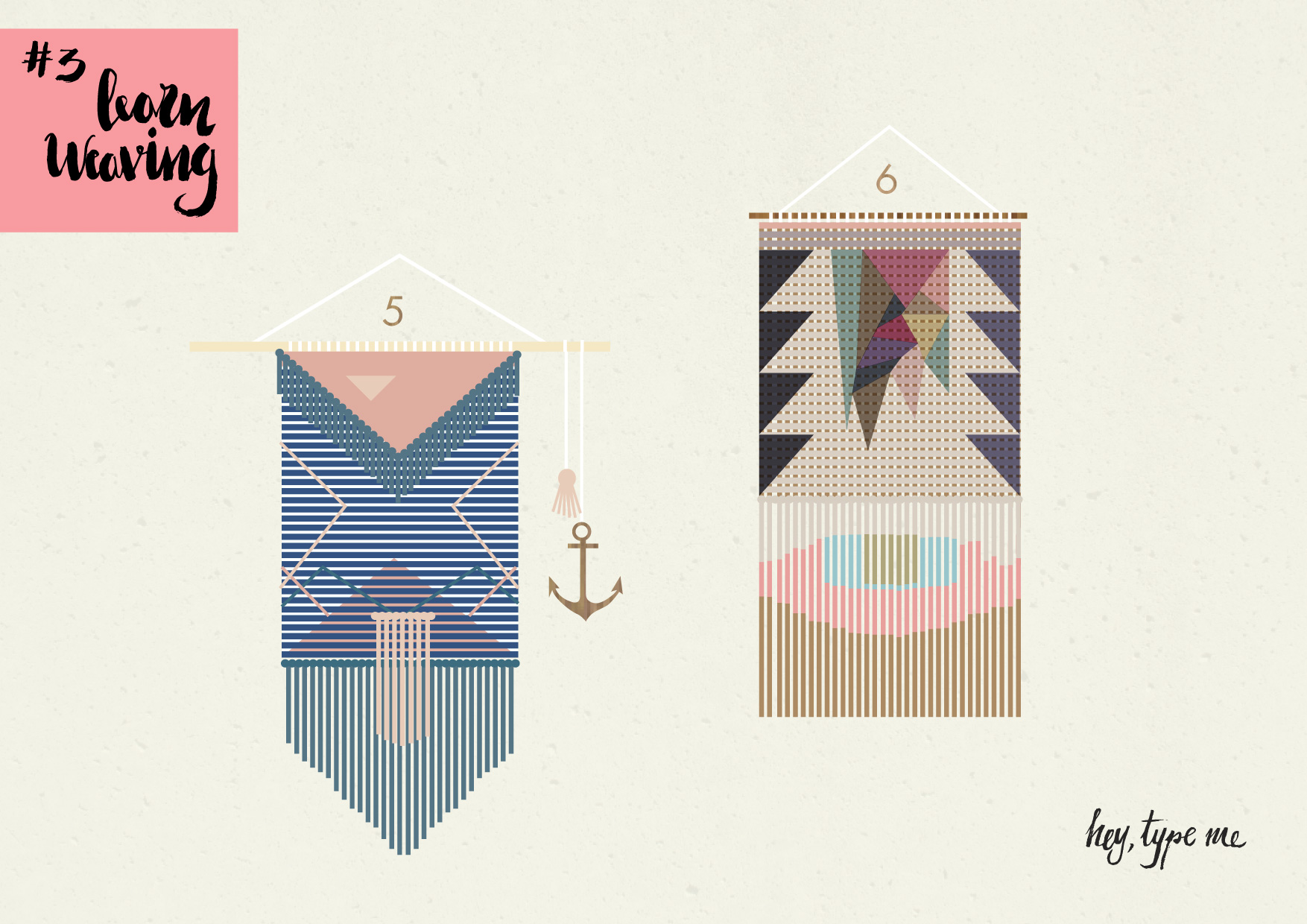 This way you will be busy doing it for hours while outside is raining cats and dogs, and you with your favorite blanked doing a beautiful weaving for your wall, like the ones that I’m showing you in the illustration. Every tapestry is inspired by a real wall. If you click in the numbers you will be able to see the page where you will find them, and also, a DIY tutorial in the number 7.
