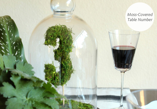 Genial la idea de recubrir el número con diferentes acabados, en este caso con musgo y protegido con cristal. Crea un pequeño escenario con mucho encanto. Otras ideas es cubrir el número con purpurina, lentejuelas… (foto vía)