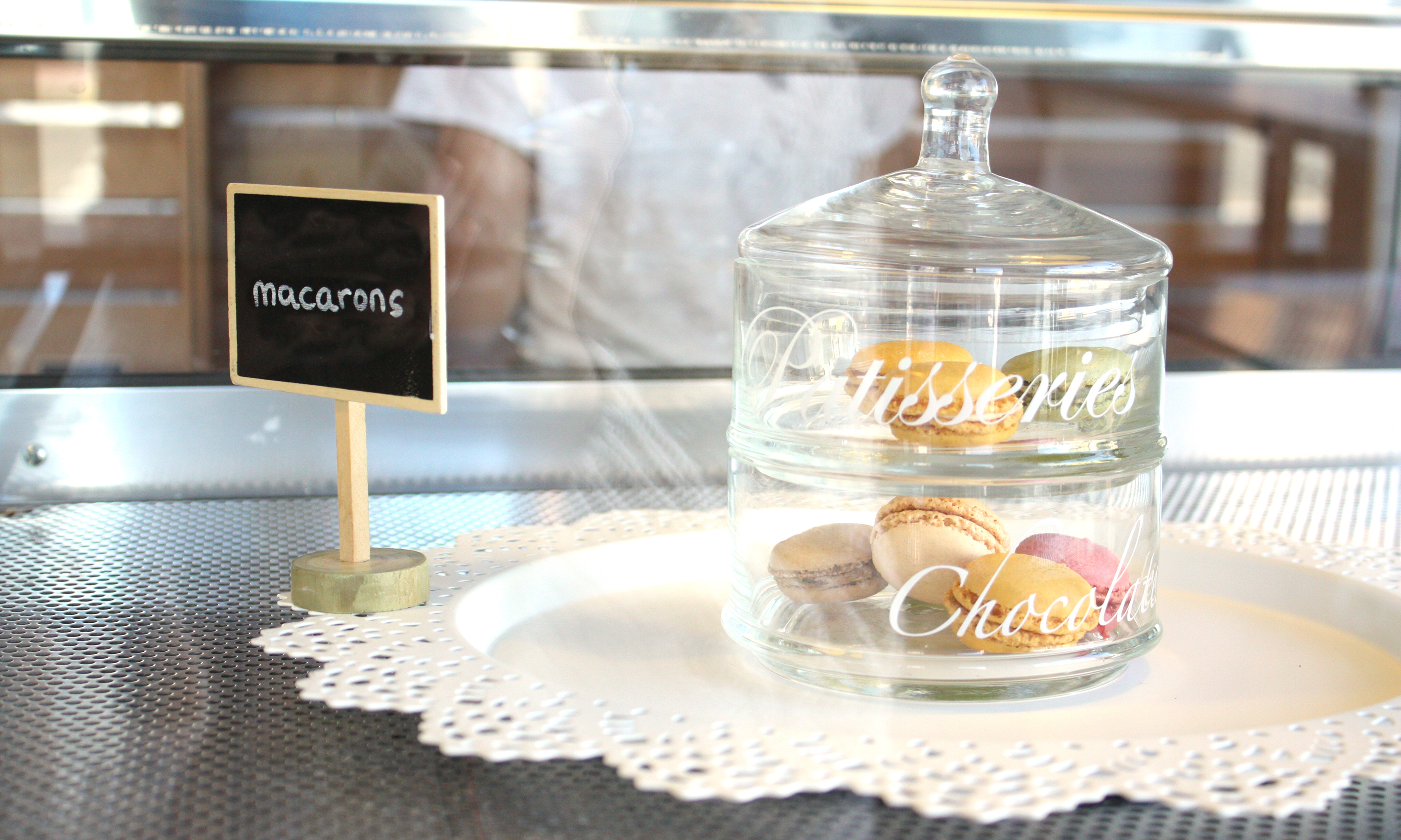 Detrás de la barra unos cajones de madera hacen su función de estanterías para las diferentes clases de pan. Le da un toque muy de «despacho de pan de toda la vida», súper acogedor.