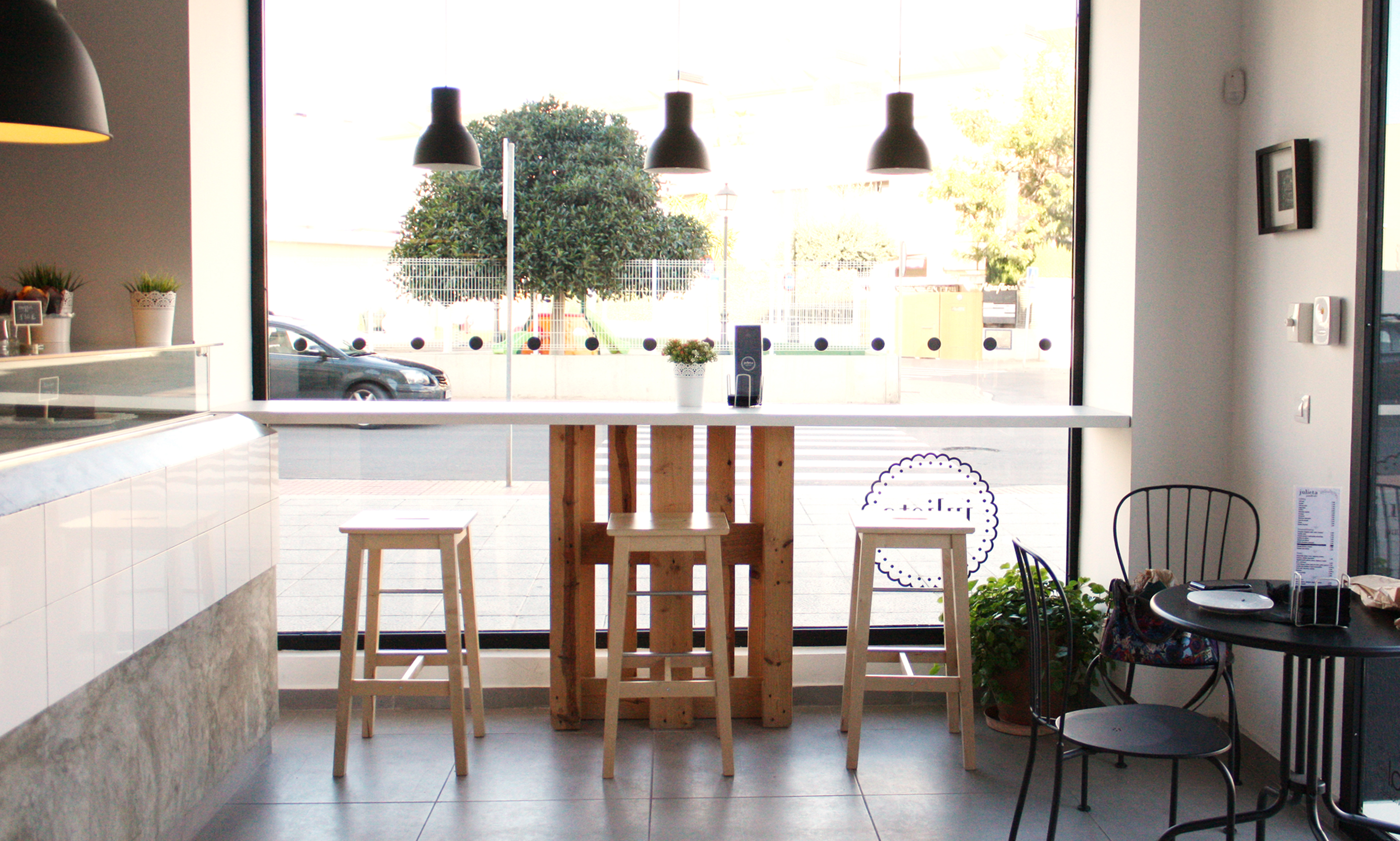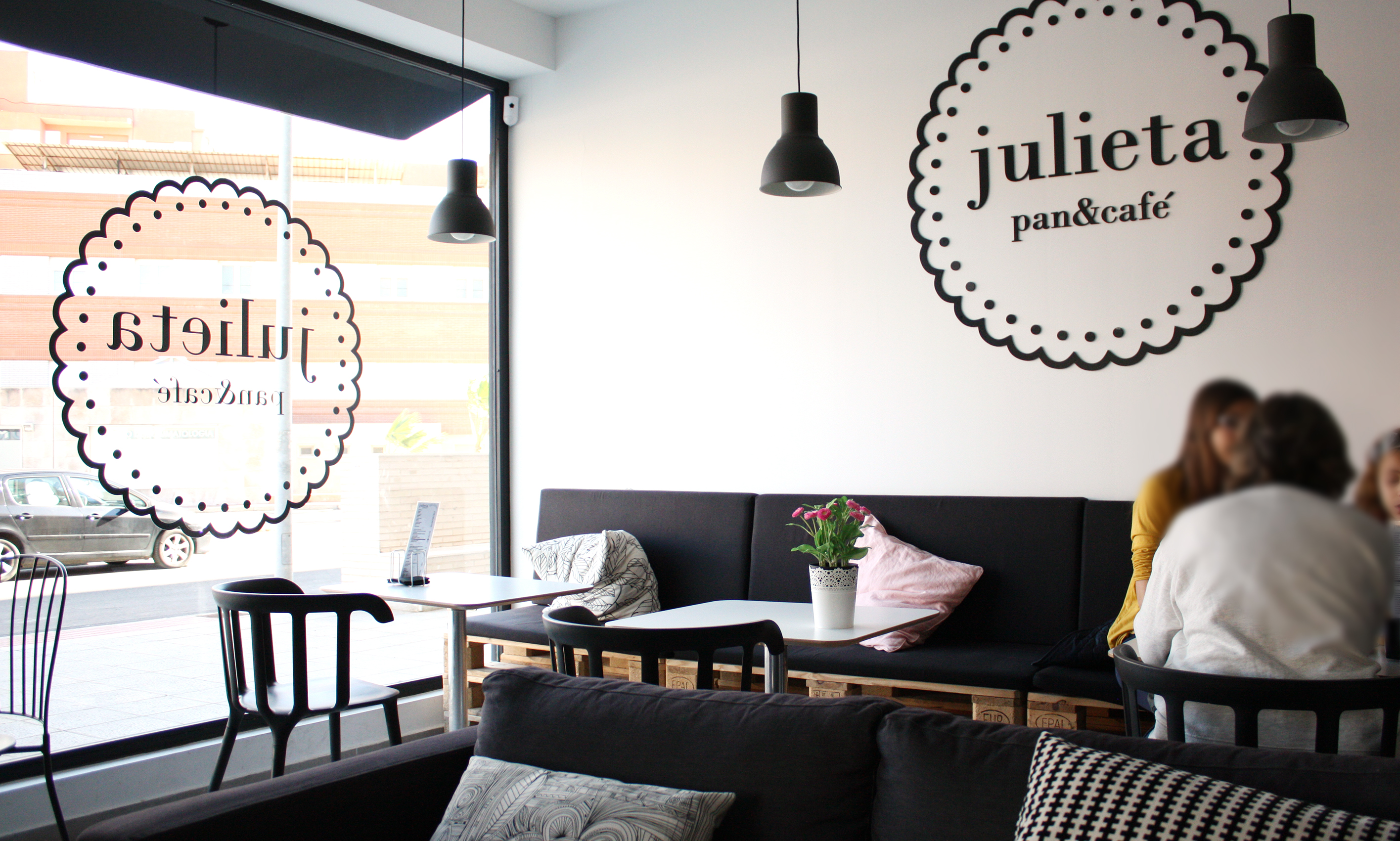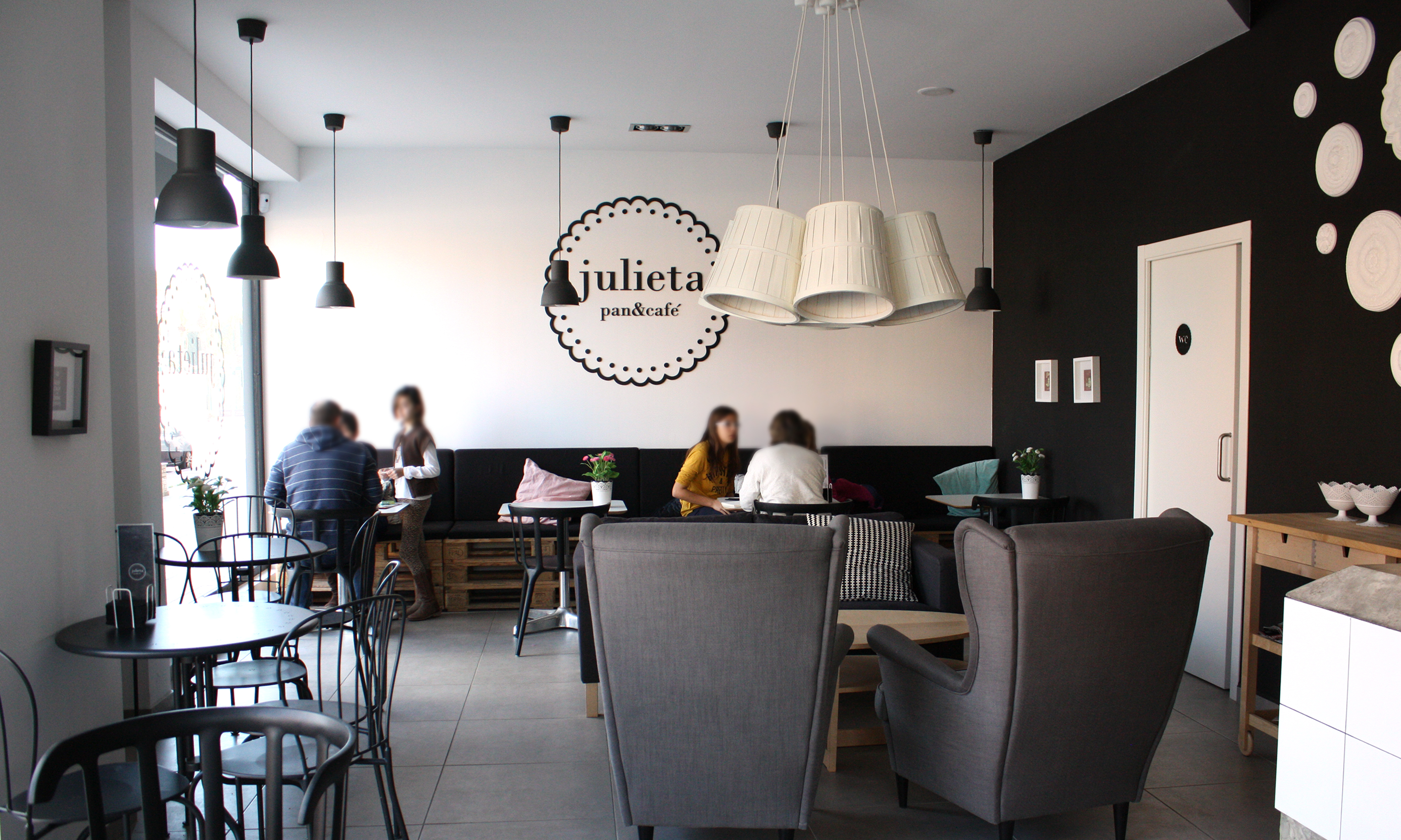 Vitale studio fueron los encargados del proyecto de diseño de Julieta pan&café, desde el logotipo hasta toda la decoración del local es obra suya (Enhorabuena!). Según nos comenta su propietaria todo el mobiliario que hay en la cafetería es de Ikea, mesas, sillas, lámparas… Bendita Ikea!!