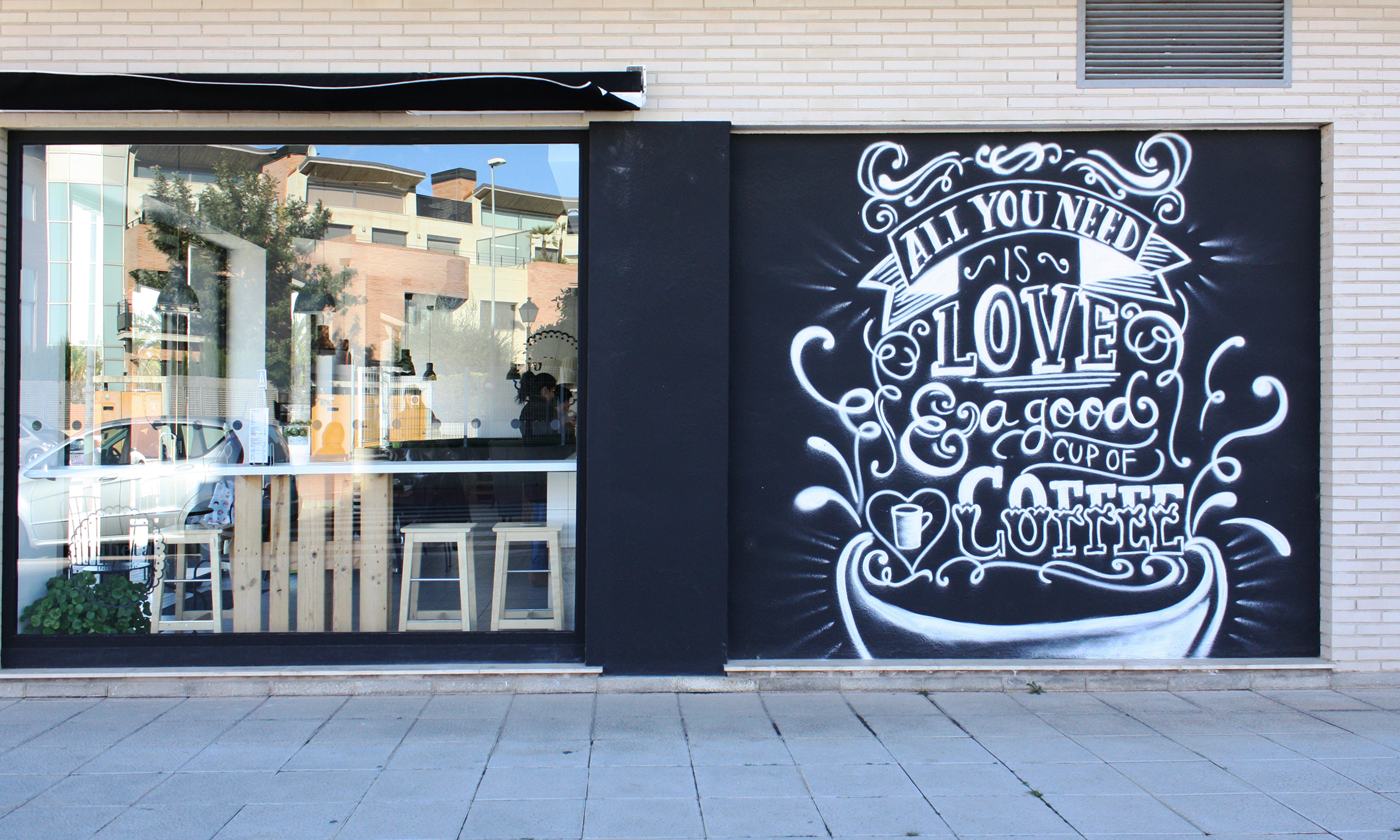 Toda la pared del fondo de la cafetería la ocupa el logo del local y bajo de el una bancada de pallets hacen su función de sofá, al igual que algunas mesas altas que encontramos repartidas por los ventanales la decoración con pallets de madera tratada le dan el toque de calidez entre toda la sobriedad del blanco y negro.
