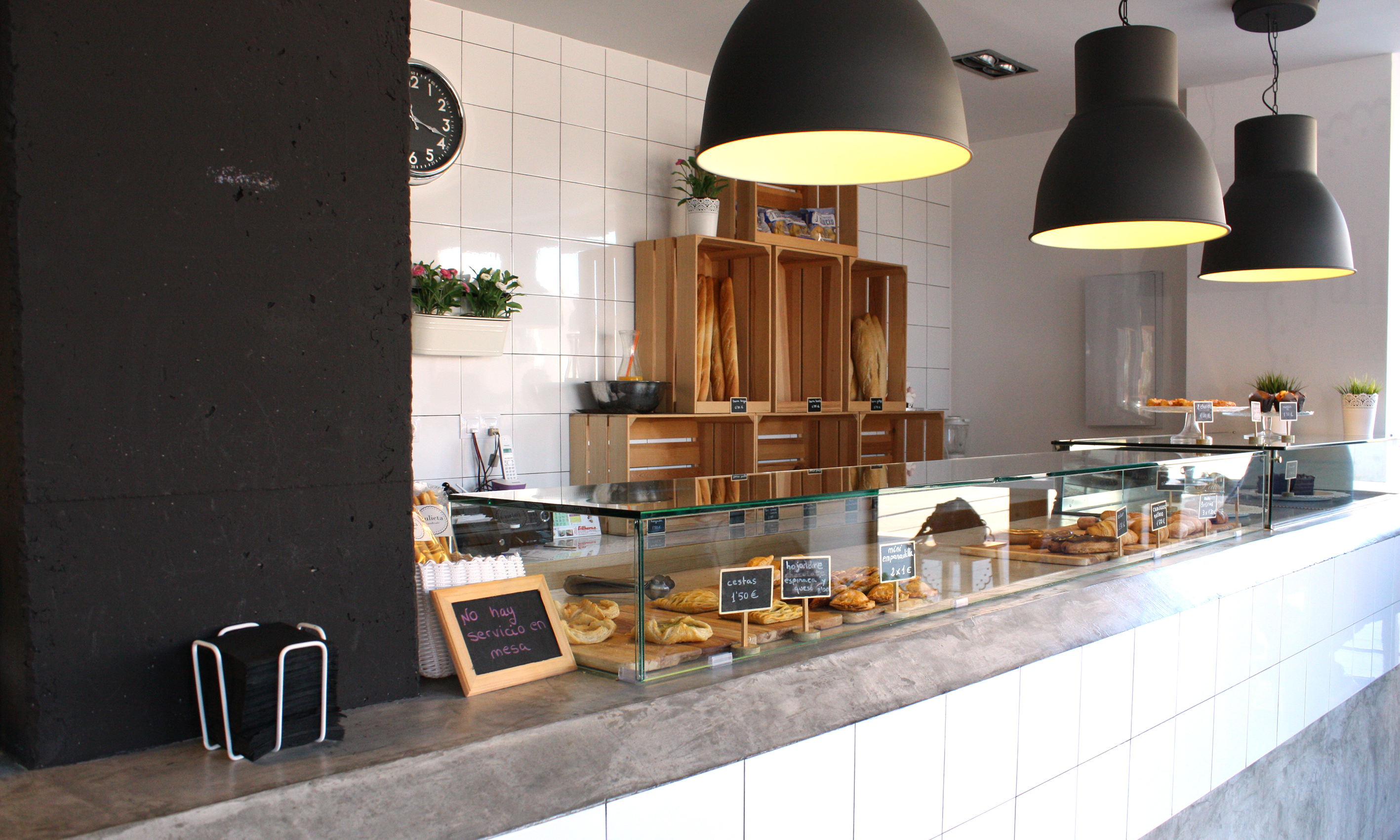 Nada más cruzar la puerta nos encontramos de frente una barra de hormigón con azulejo blanco y unas enormes lámparas de estilo industrial. Encima de la barra una vitrina llena de cosas buenísimas (hablamos desde la experiencia…) además toda la bollería y panadería es de elaboración propia.
