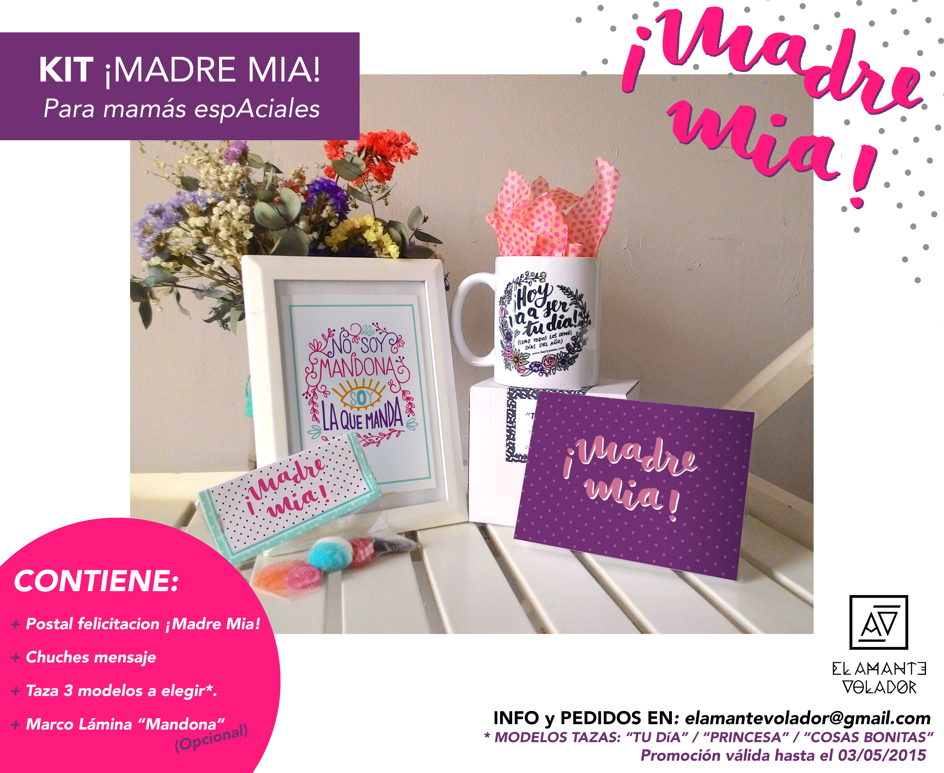 Desde El Amante Volador te traemos varias ideas para ese día, como por ejemplo el kit «MADRE MIA» que contiene: Una postal felicitación, Un paquete de chuches con mensaje, Una taza la cual te ofrecemos 3 modelos a elegir («TU DÍA», «PRINCESA» o «COSAS BONITAS») y Una lámina con marco de 13x18cm de el modelo MANDONA. (Lámina es opcional.)
