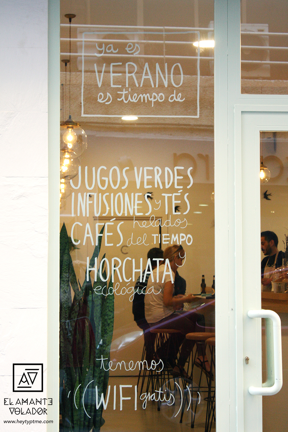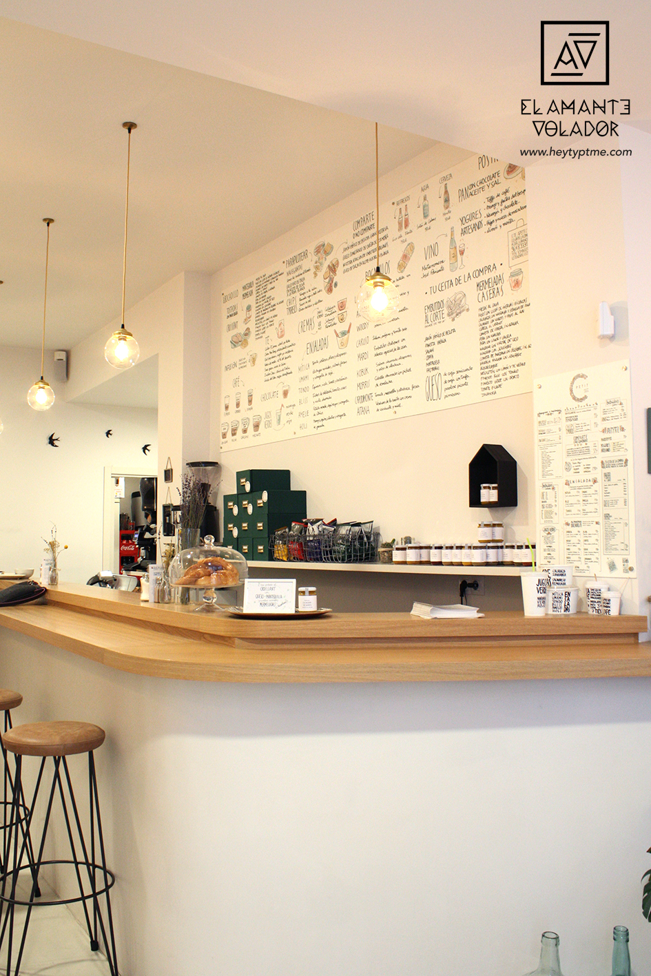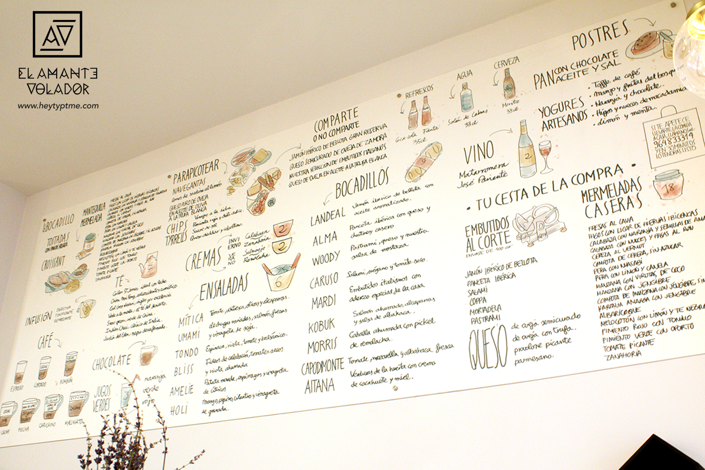 Tanto la carta, el gran panel de detrás de la barra y los letterings de las puertas están escritos a mano por Ana. Ella misma escribió a mano uno a uno cada unos de los productos y dibujos que aparecen en la carta.