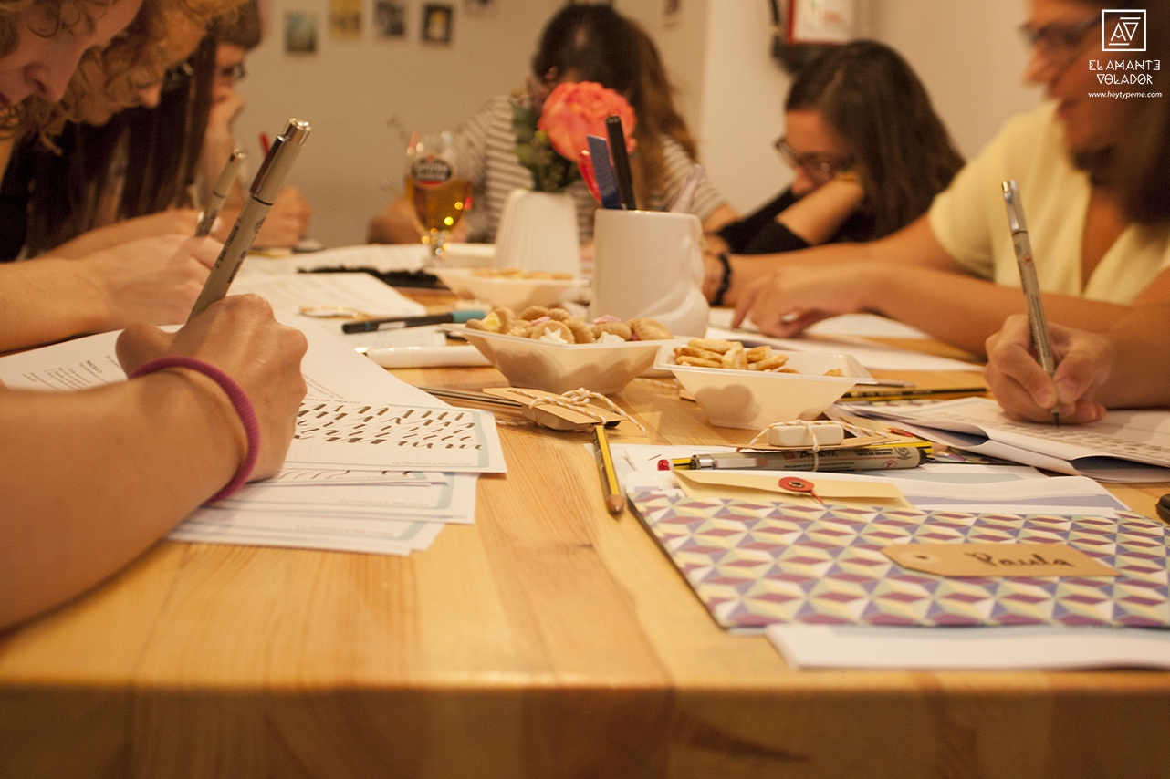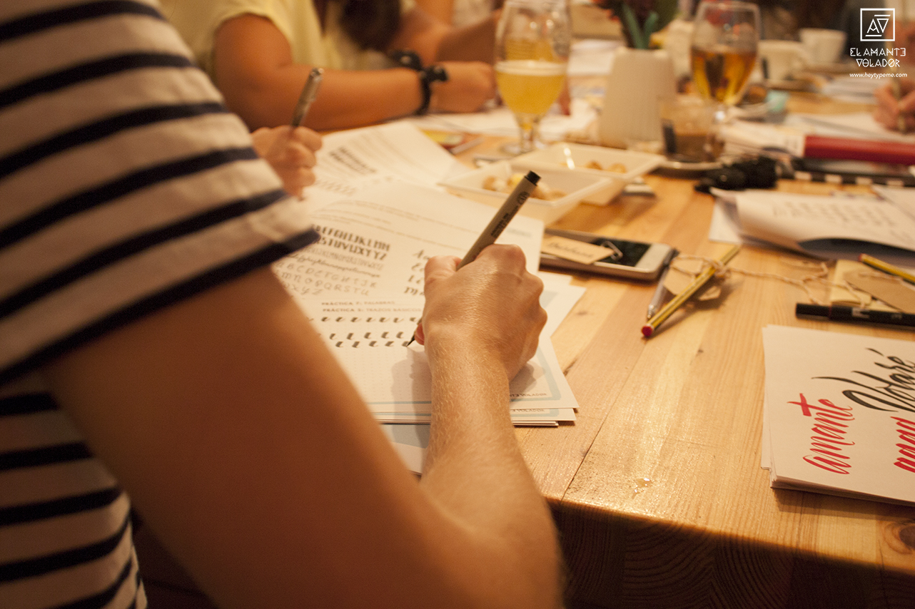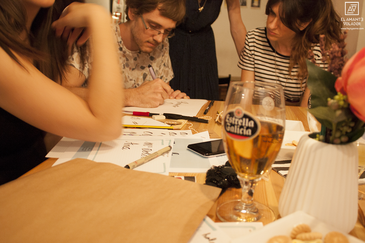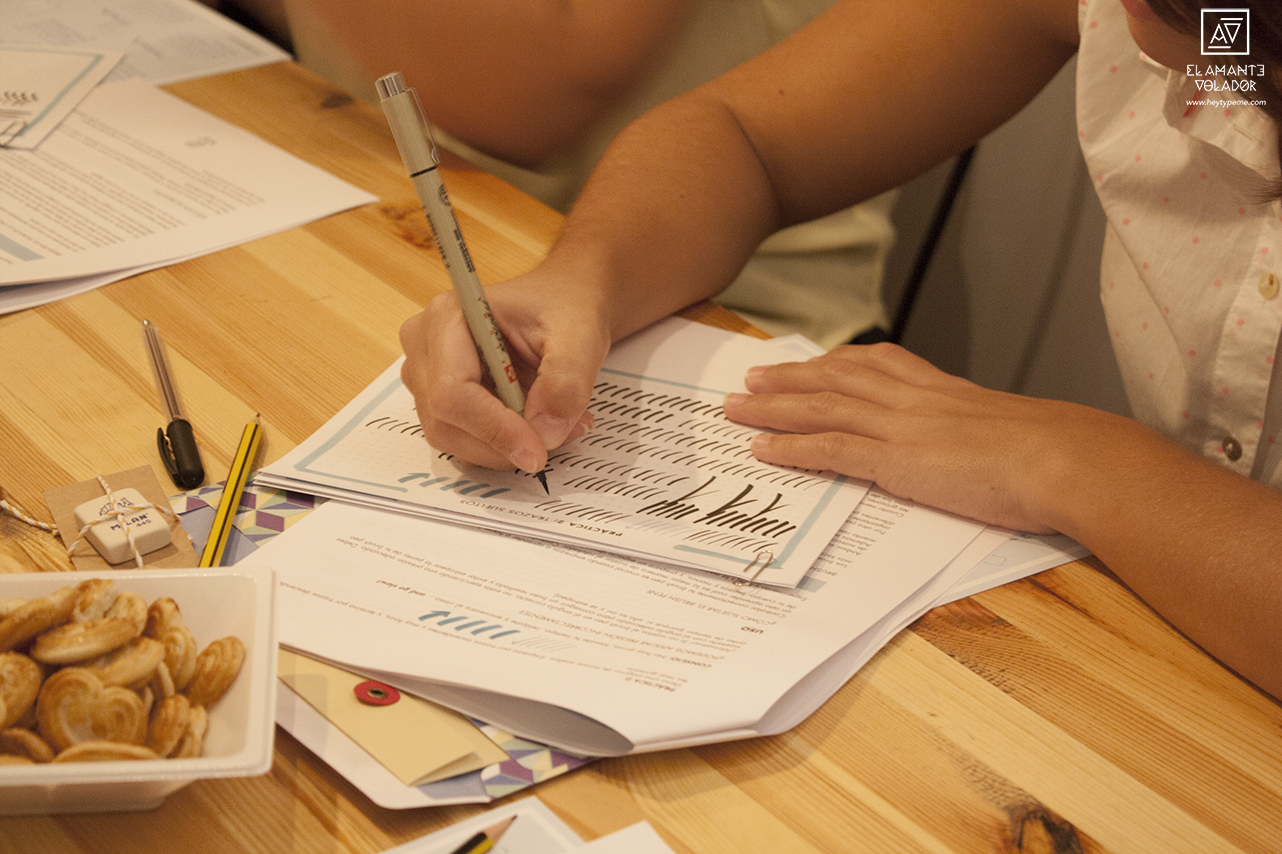 Además de la parte práctica, aprendimos un poco de teoría. ¿Qué es el lettering? ¿Cómo sujetar el rotulador y cómo no hacerlo? ¿Cómo ejercer la presión correcta? ¿Qué proceso seguimos en El Amante Volador para diseñar nuestros letterings? Y muchas más cosas.