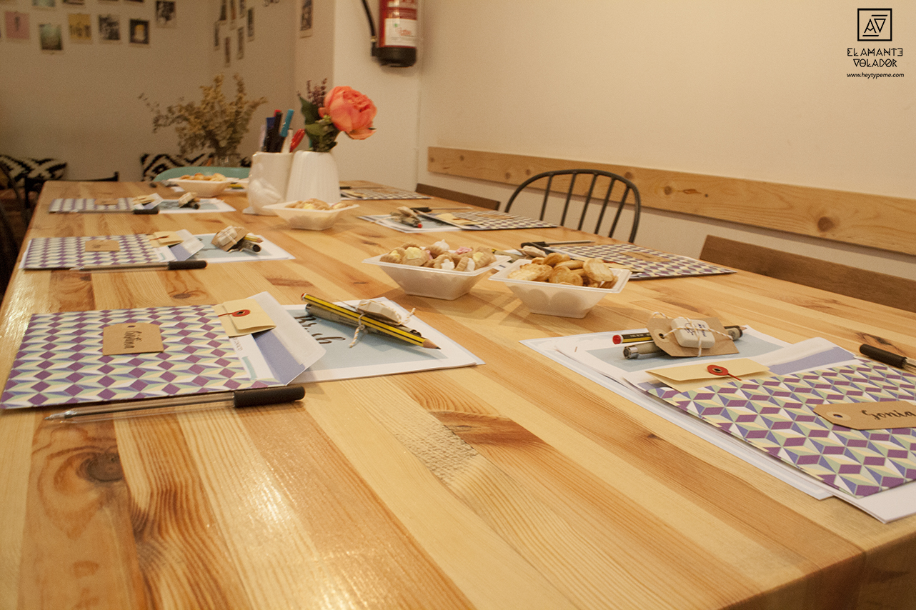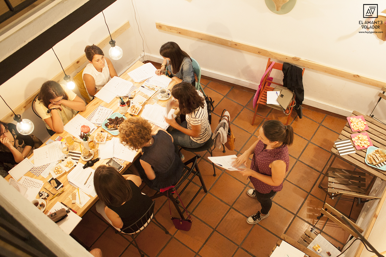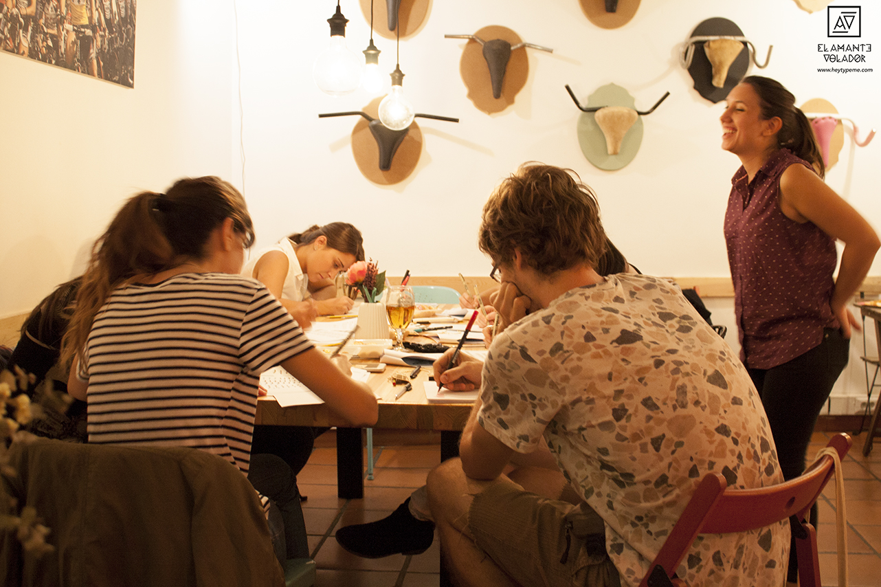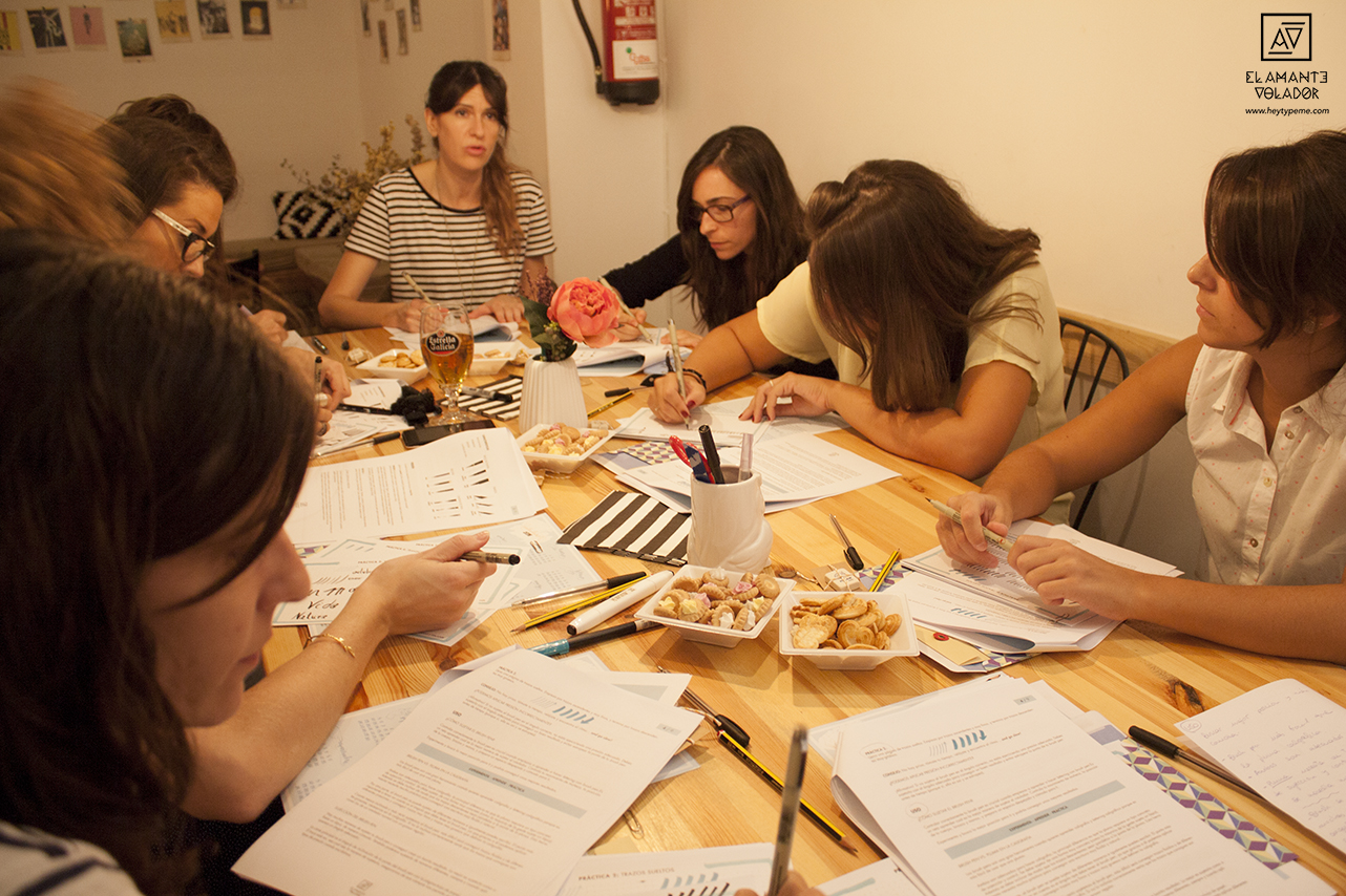 Además de la parte práctica, aprendimos un poco de teoría. ¿Qué es el lettering? ¿Cómo sujetar el rotulador y cómo no hacerlo? ¿Cómo ejercer la presión correcta? ¿Qué proceso seguimos en El Amante Volador para diseñar nuestros letterings? Y muchas más cosas.