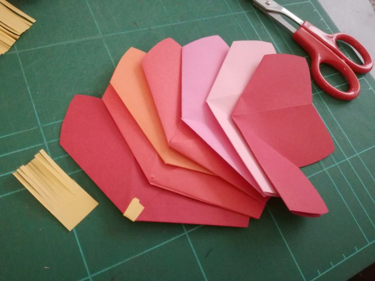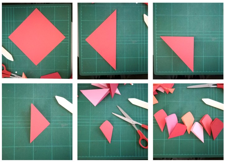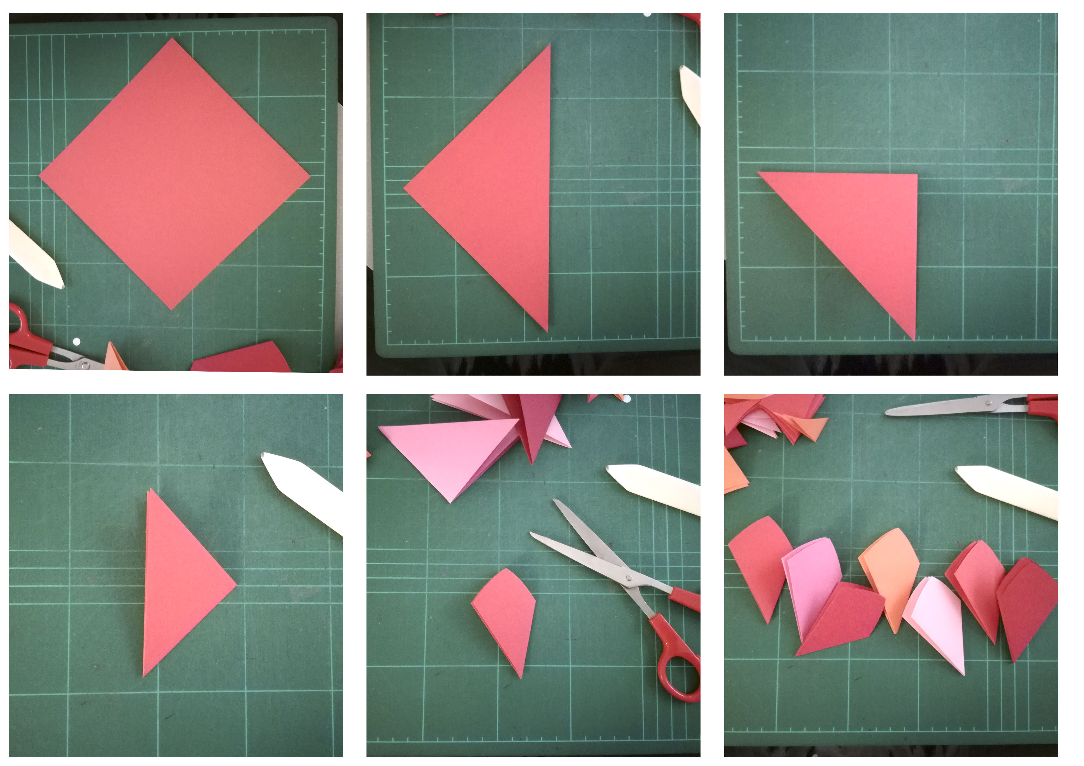 - Dobla los papeles de colores 3 veces (por la mitad) y corta el triángulo resultante para que parezca un pétalo.
