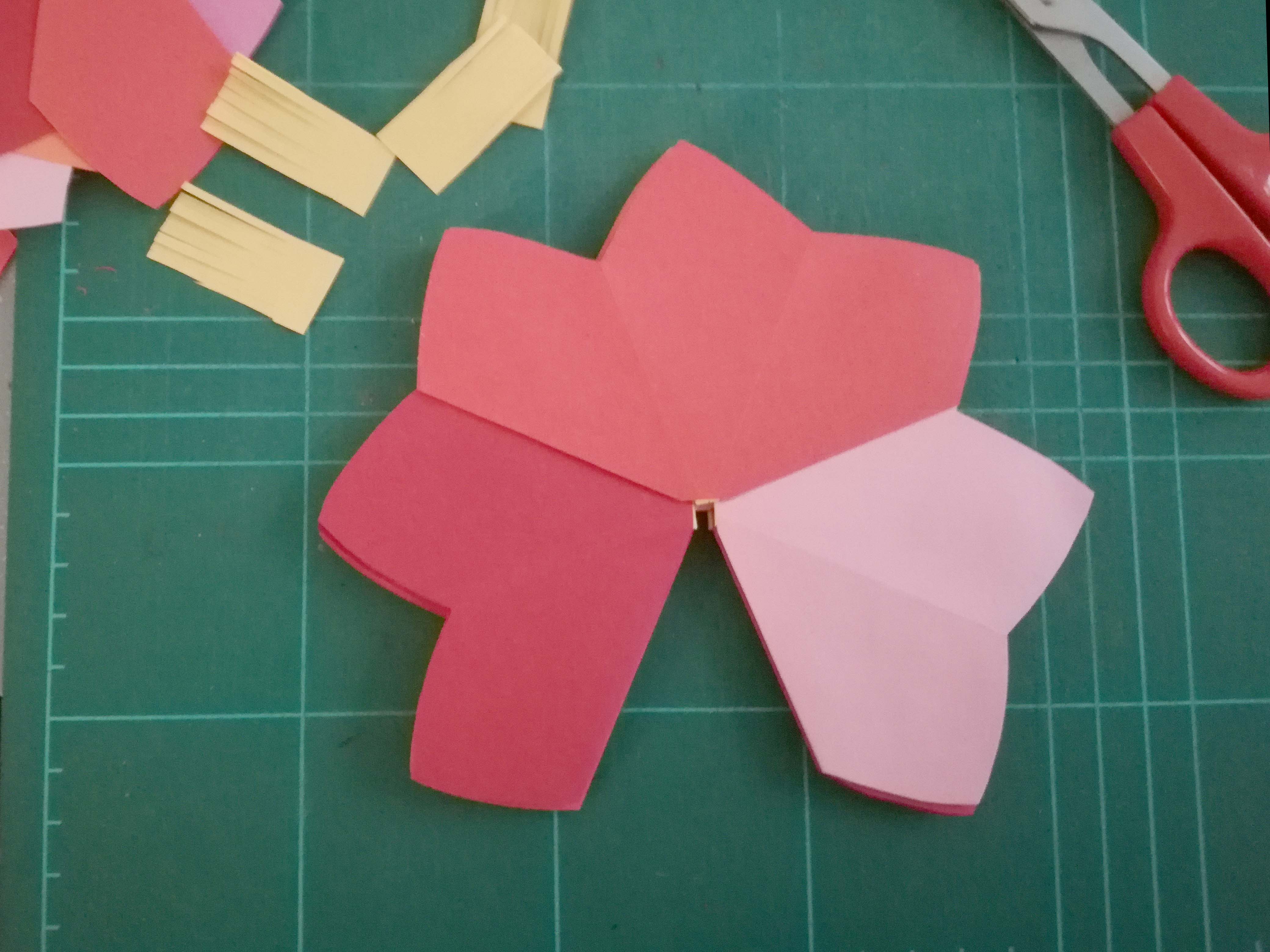- Una vez tengas las 7 flores dobladas, ábrelas y corta uno de los triángulos. Pon pegamento y únelos. Plega las flores por la mitad.
