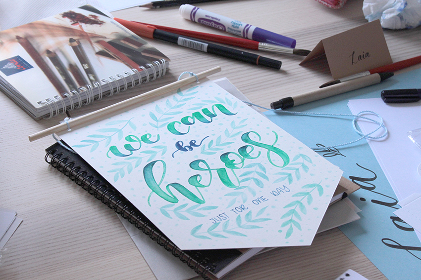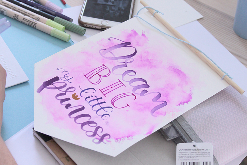 En el segundo bloque conocieron diferentes técnicas decorativas con los Tombow Dual Brush Pen de colores (sombreados, blenders, fondos de acuarela, decoraciones…) y crearon un lettering sobre acuarela de Tombow en forma de banderín.