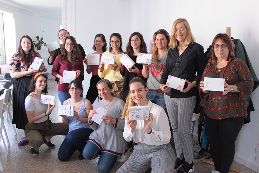 Tras estos tres bloques llegó el proyecto final: decorar con todo lo que han practicado una caja Buntbox, tapa + base. Cada alumna decidió como decorarla, con que técnicas, ilustraciones botánicas, fondos de acuarela, escritura… creando así su proyecto final de evento.