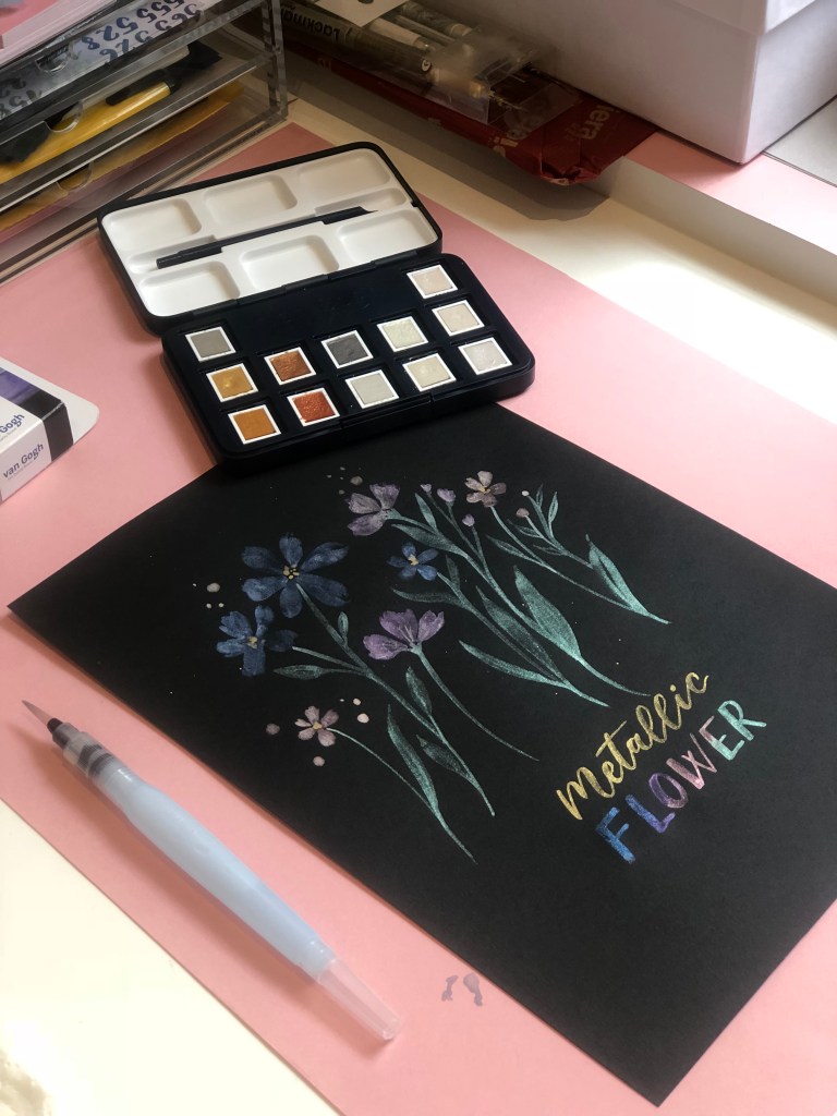 Royal Talens, en su gama Van Gogh, tiene papel acuarela de color negro, para que utilices este tipo de acuarelas y otros rotuladores o bolígrafos metalizados, de colores opacos, o acuarelas de interferencia, así como otro tipo de técnicas.