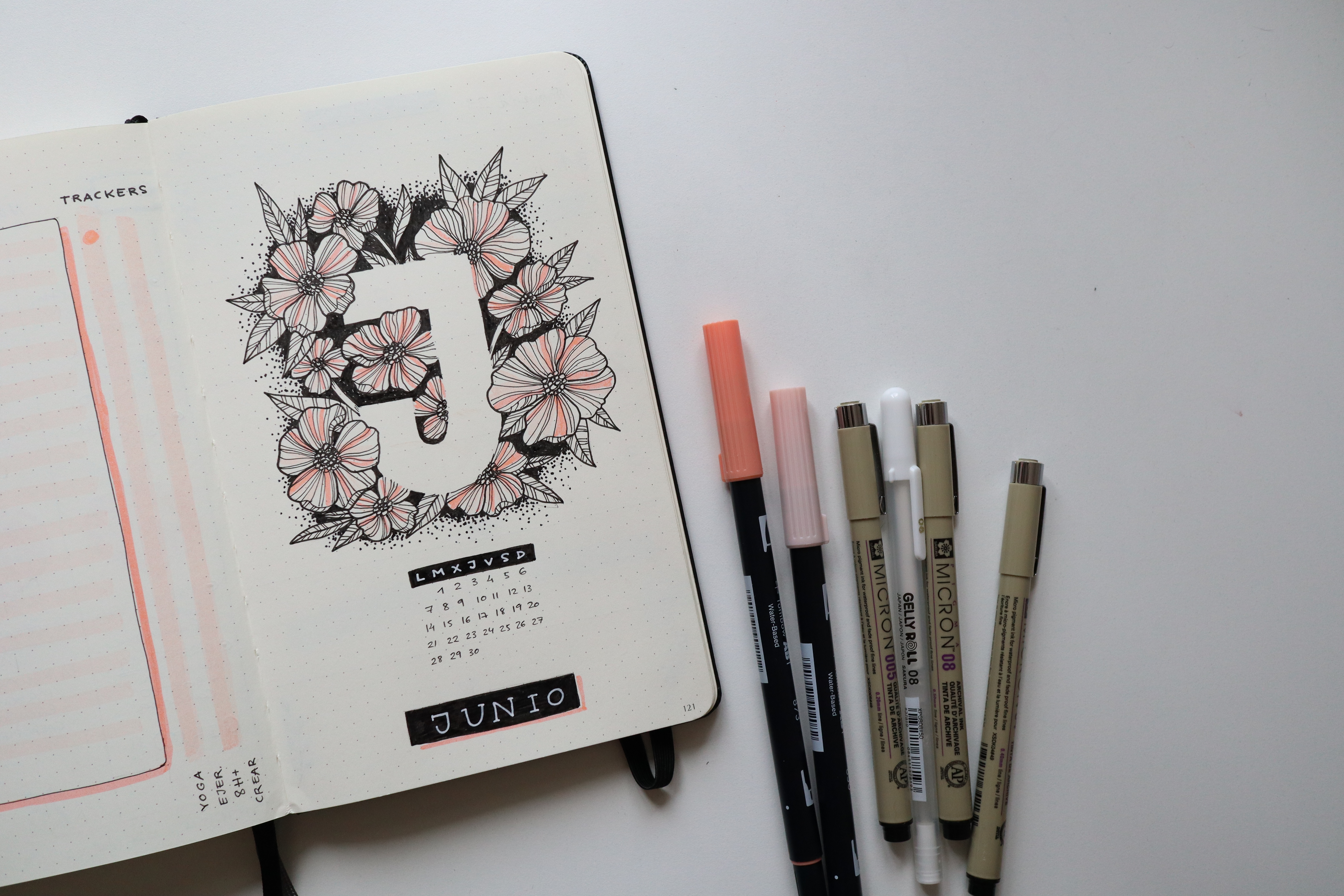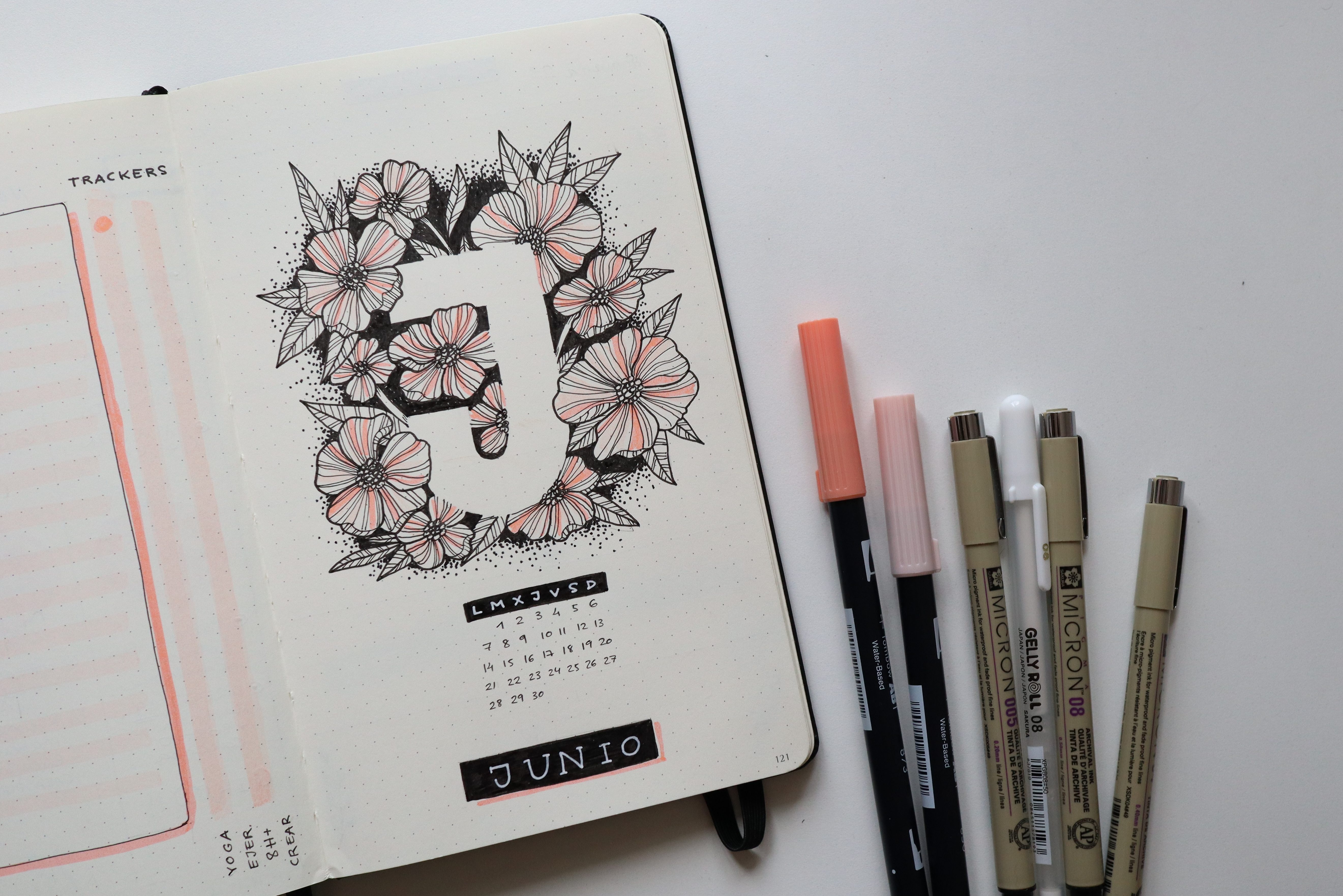 Para junio una de mis patreons me dio la idea de crear flores con fine liner para decorar la portada y el mes de junio de mi journal.
