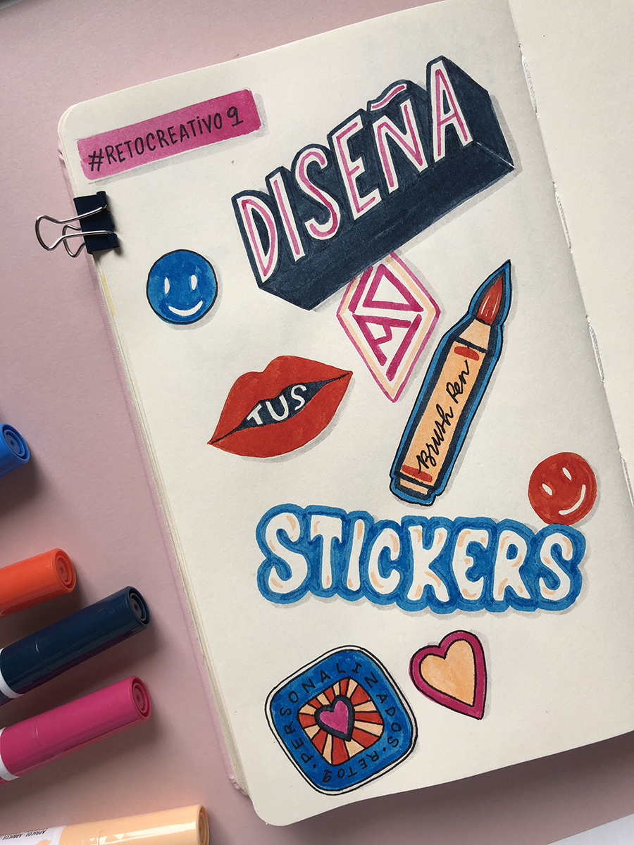 Si tuvieras tu propia marca y creases una pequeña colección de pegatinas, ¿cómo serían? Pues en este reto os planteo justamente eso. Crear desde cero tu pequeña colección de stickers en la que tu eres la protagonista. Elige los colores, las palabras y frases, los elementos decorativos y las formas que tendrán esos stickers. ¡No olvides añadir un sombreado para dar volumen a tus pegatinas!.