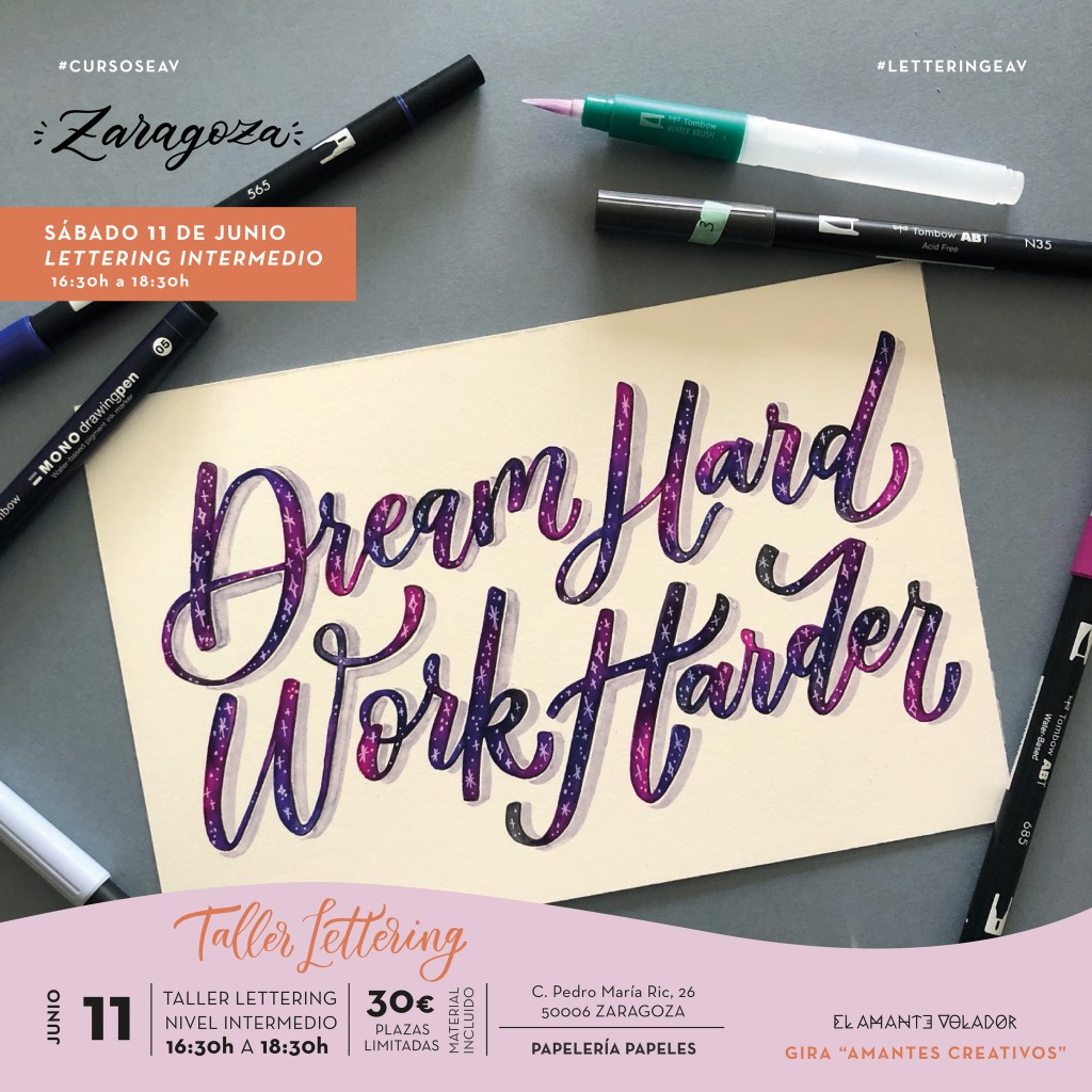 ¿Qué vas a hacer los próximos sábados? Si vives cerca de Zaragoza o de de Valencia es tu oportunidad de pasar un sábado creativo genial. Estos serán los 3 últimos talleres de lettering que impartiré (hasta después de verano). Serán tres talleres muy especiales donde aprender y practicar distintos tipos de letra y diferentes maneras de decorarlas (incluyendo degradados y sombreados), diferentes composiciones y elementos decorativos, con rotuladores de base agua como son los Tombow Dual Brush Pen.